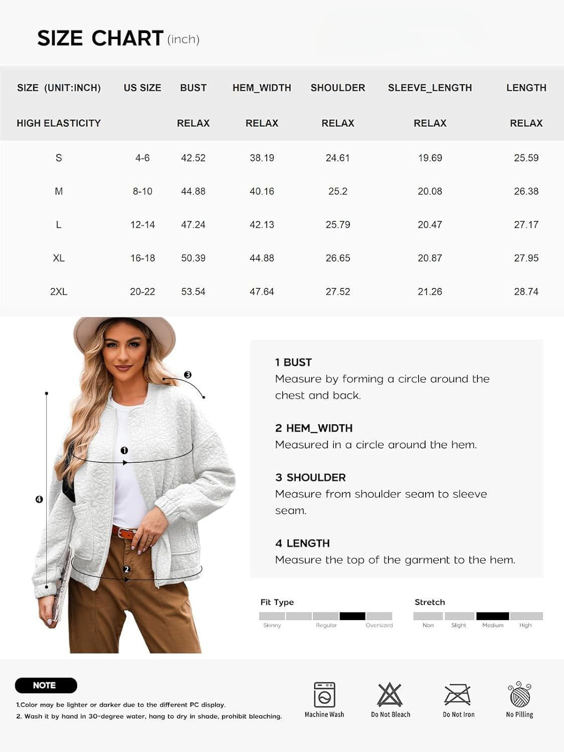 SUGGESTION: Please check measurements before ordering. Kindly pay attention that different colors have different sizes. Machine/Hand wash cold, line dry.