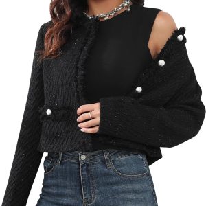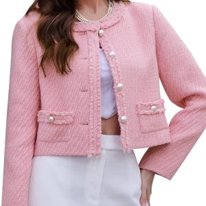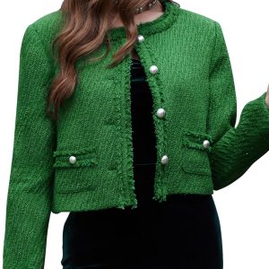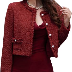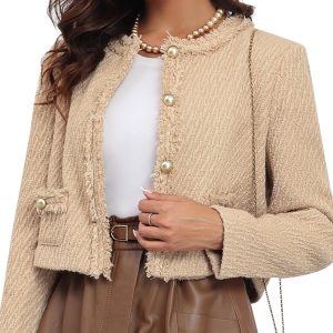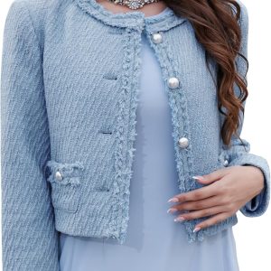 Tweed Blazer Jackets for Women Long Sleeve Elegant Office Work Business Casual Cropped Tweed Jacket
