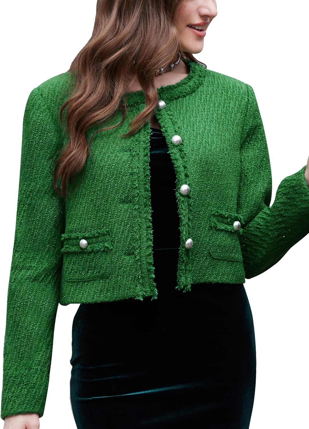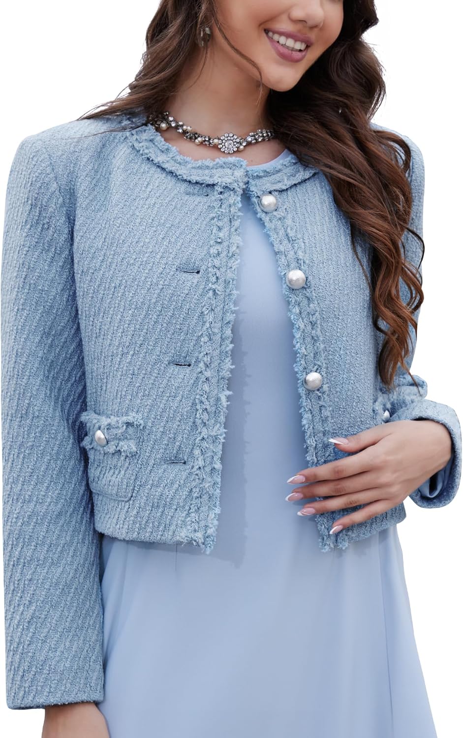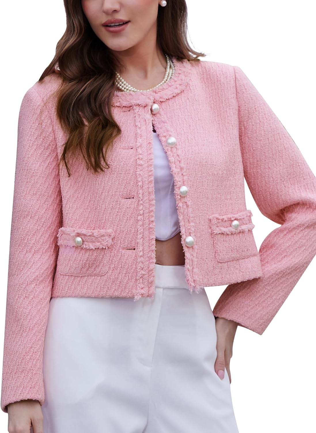 FEATURES: Timeless collarless design, Metal button with button-down closure, a raw edge, Long sleeves, Two practical pockets. This elegant cropped blazer jackets offers a modern twist on a classic style, suits for office and daily.