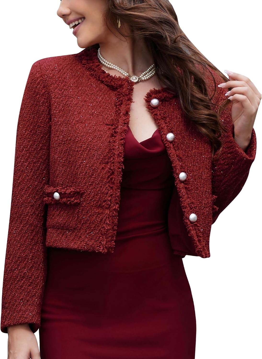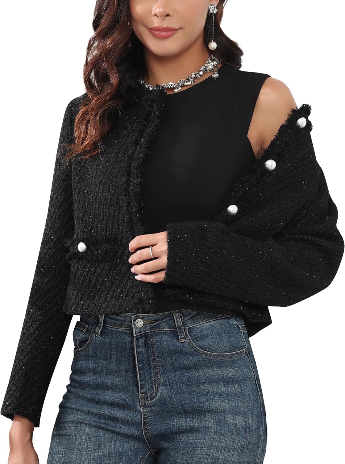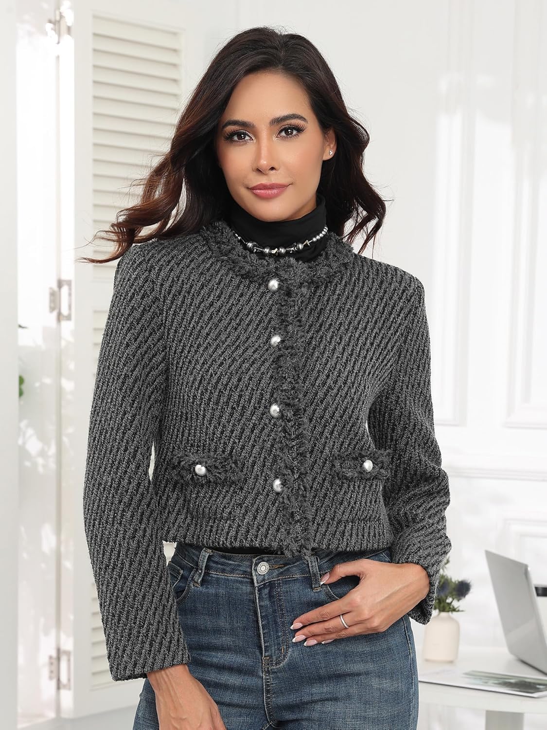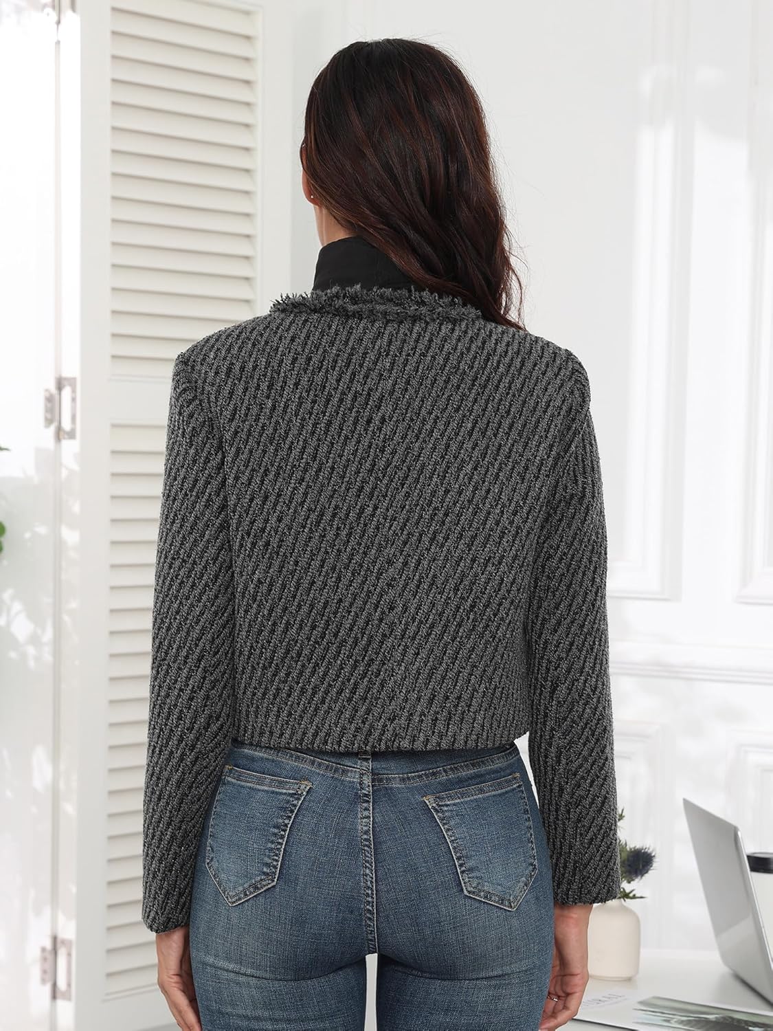 MATCH: Tweed blazer jackets for women paired with jeans, skirts, dresses and heels for a elegant stylish look. Wear this cropped blazers with a shirt and dress pants for a smart business casual occasion.
