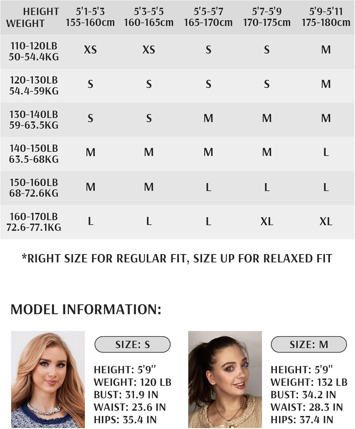 SIZE: RIGHT SIZE FOR REGULAR FIT, SIZE UP FOR RELAXED FIT. Please refer to the size chart for sizing details. Model wears in a Small, weight 121 lb, height 5’9″, bust 35 in, waist 24 in.