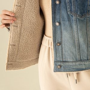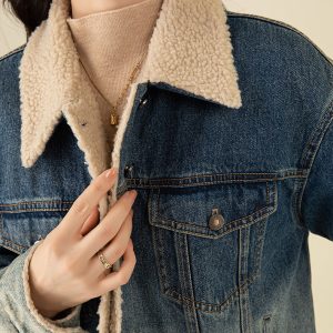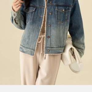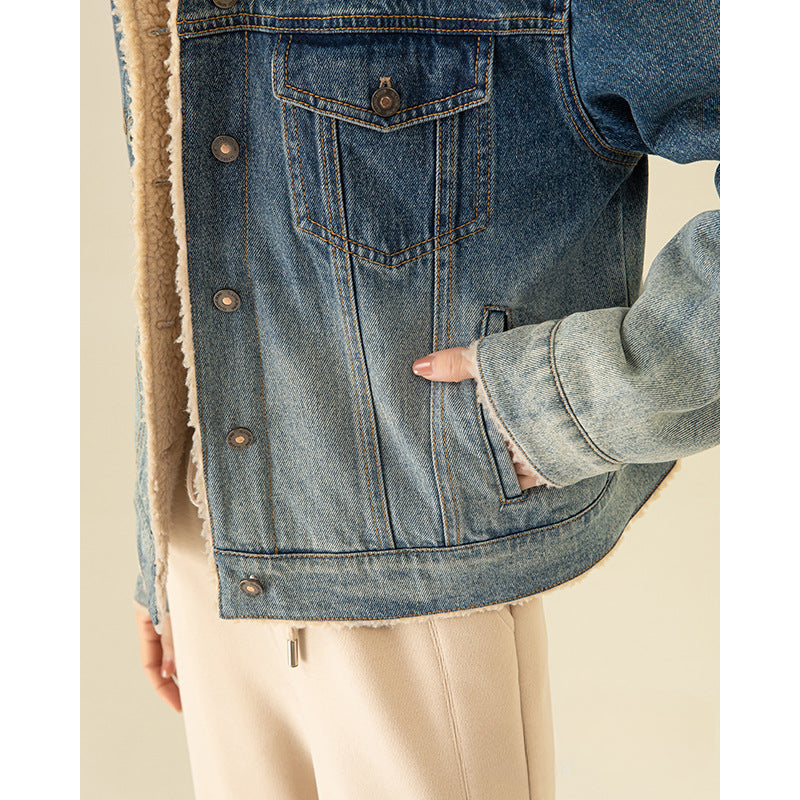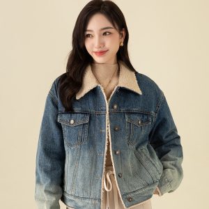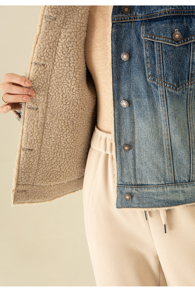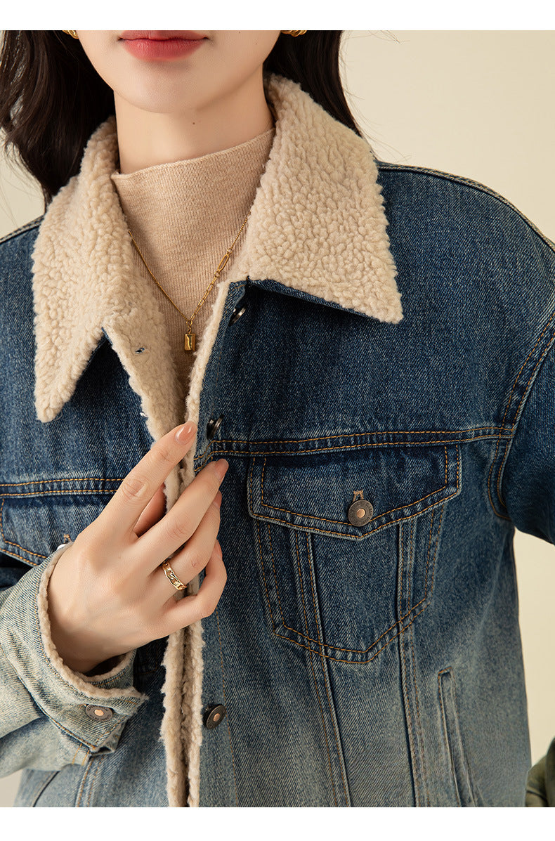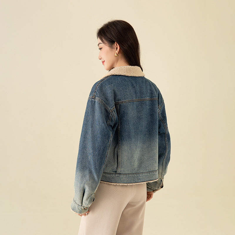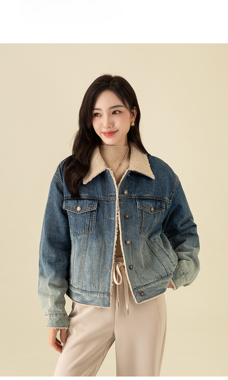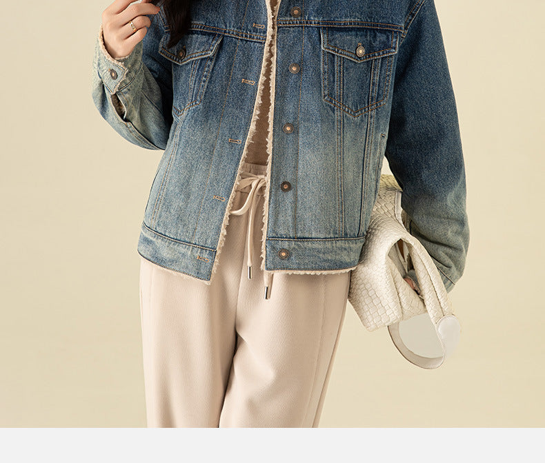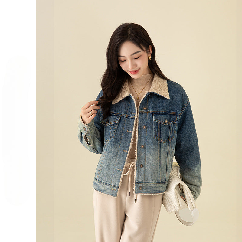 Winter short top, loose and versatile, thick and warm, with added fleece gradient denim imitation lamb fleece jacket for women