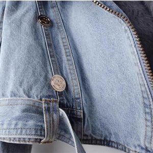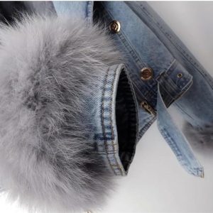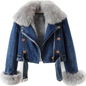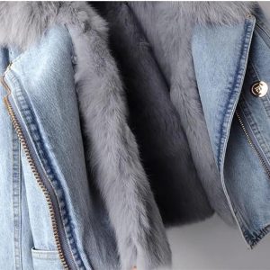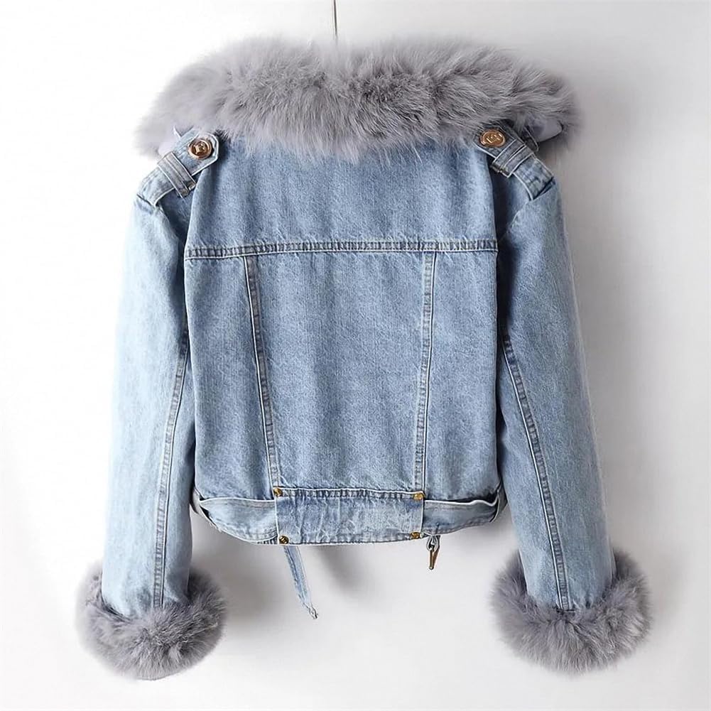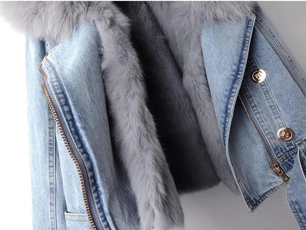 Women Denim Jacket with Fur Warm Fur Collar Rabbit Fur Lined Denim Jacket Thicken Shaggy Winter Removable Cropped Top