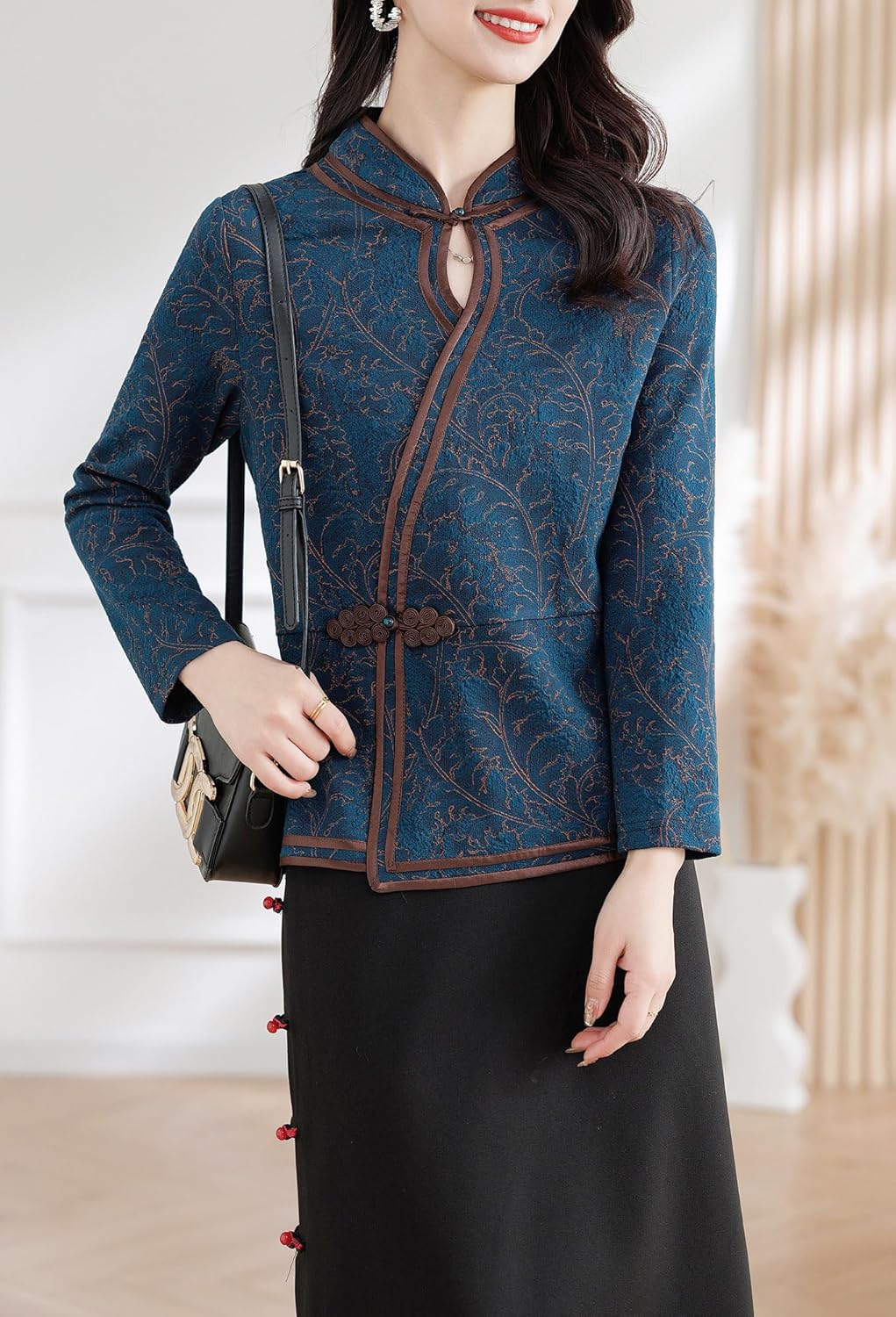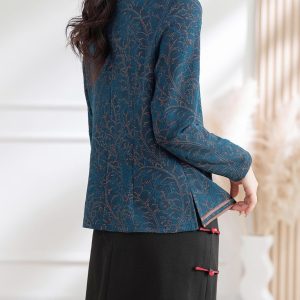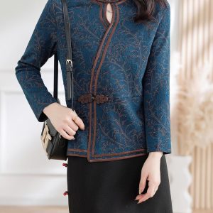 Women’s Floral Keyhole Neck Overlap Jacket with Chinese Flavor