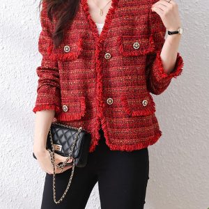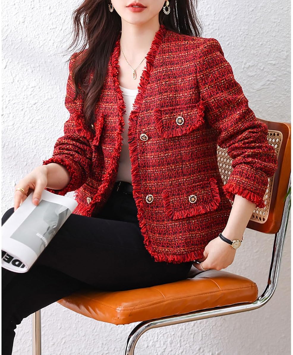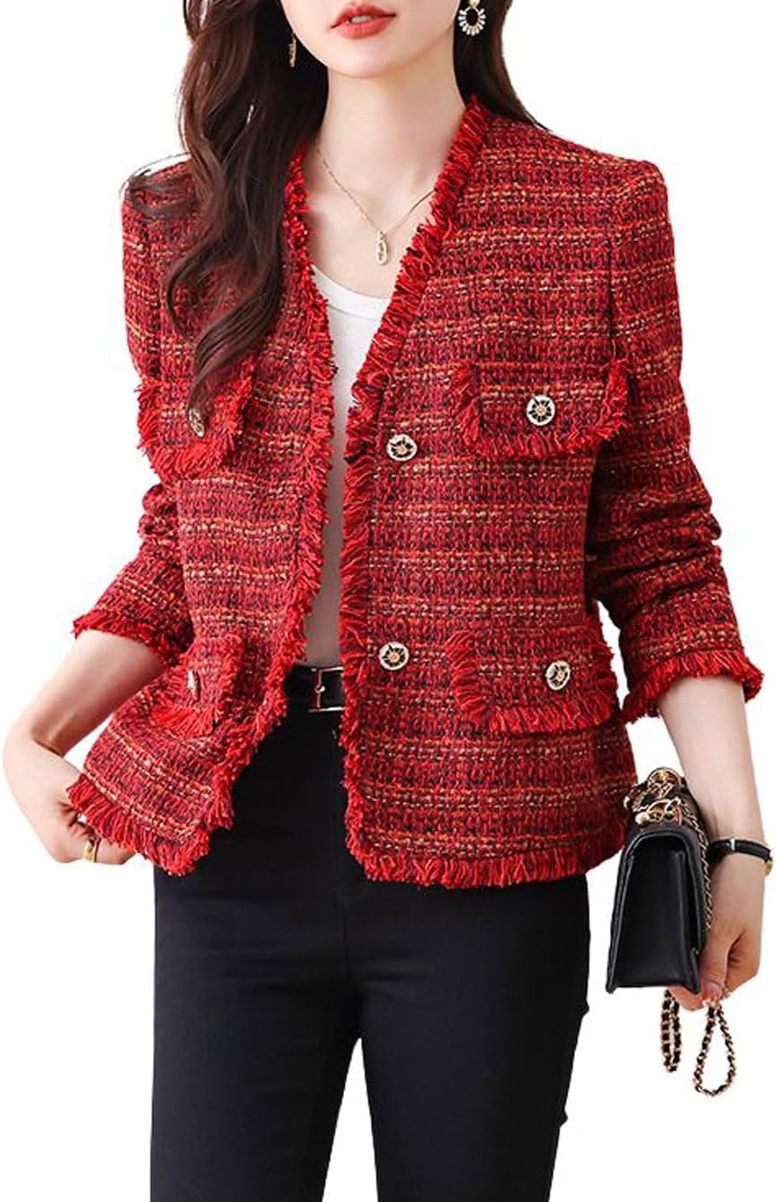 Women’s Fall V-Neck Fringed Tweed Jacket Button Down Plaid Dressy Tweed Blazer Jacket