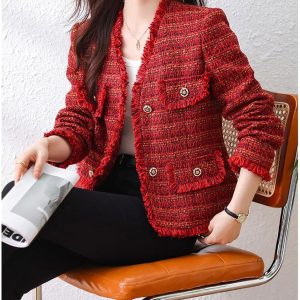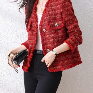 Elegant tweed blazer in slim fit, made of soft and textured high quality woven material, which is warm and comfy to wear; Soid color: red available. Perfect for spring, fall and early winter to wear