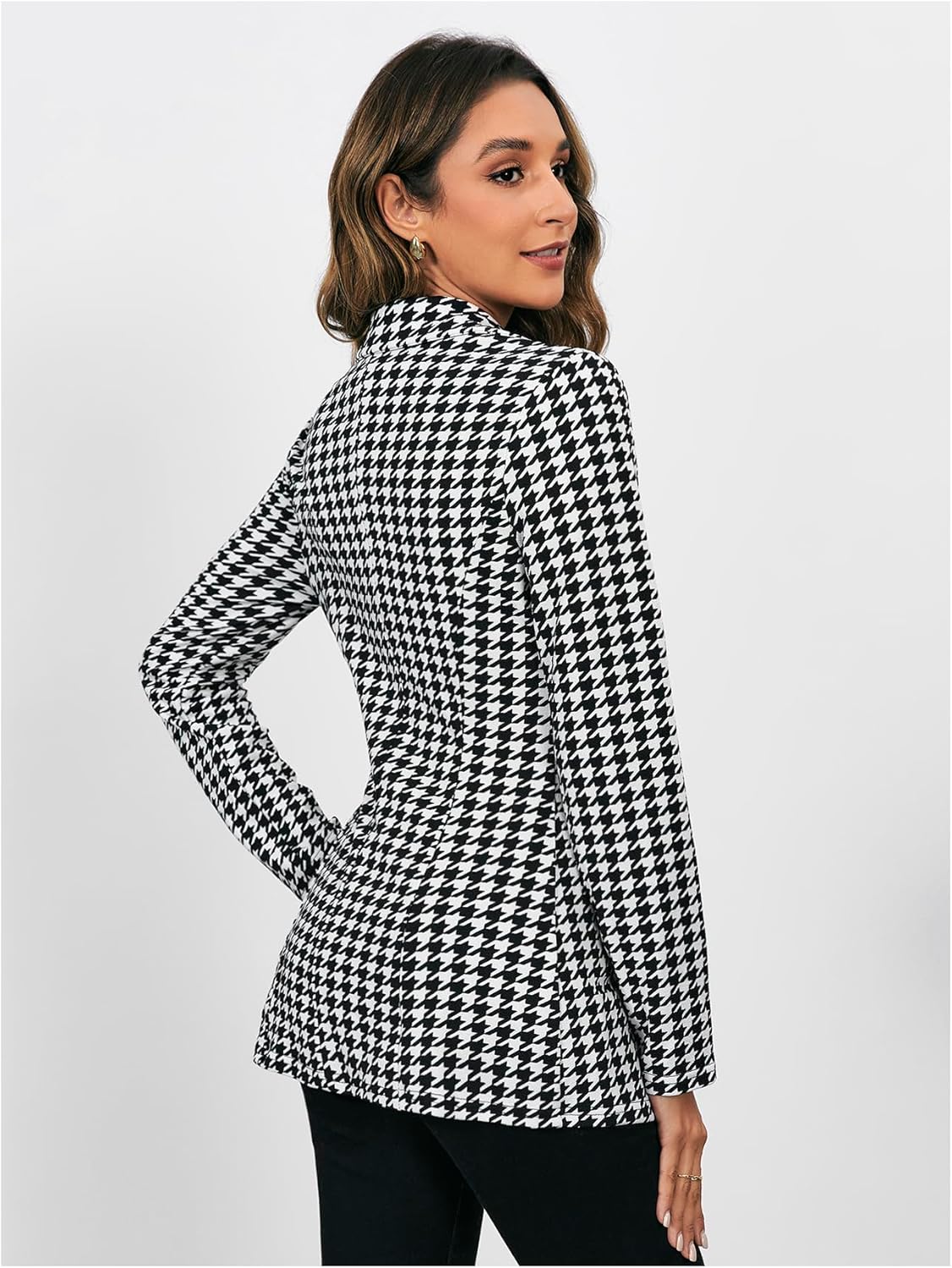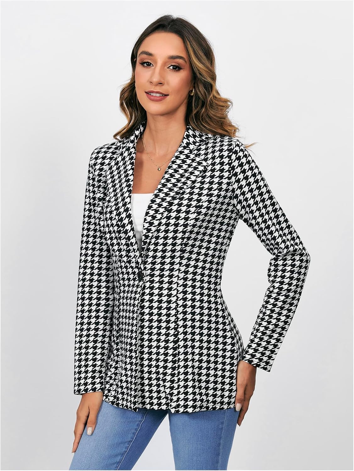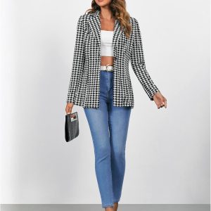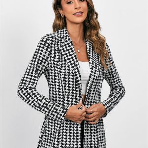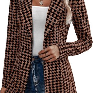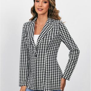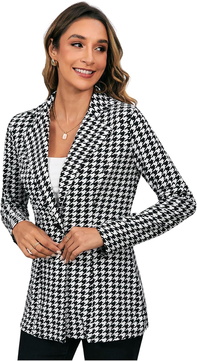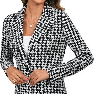 Women’s Houndstooth Blazer Jacket Button Down Long Sleeve Work Casual Blazer