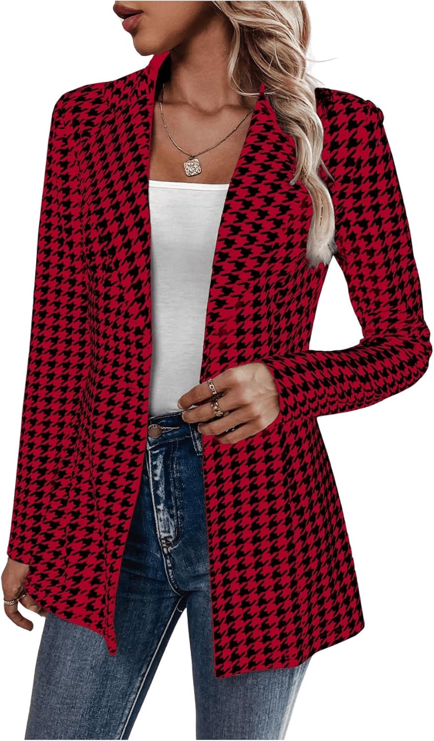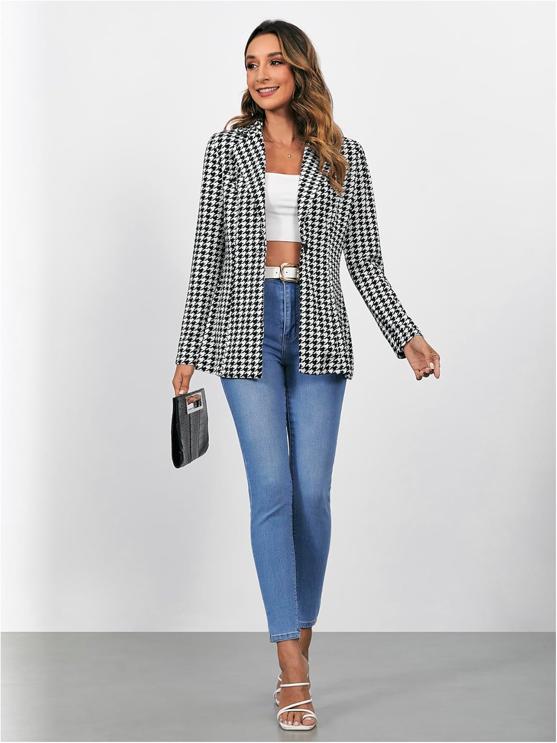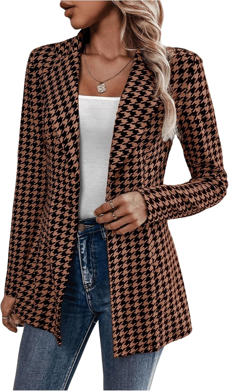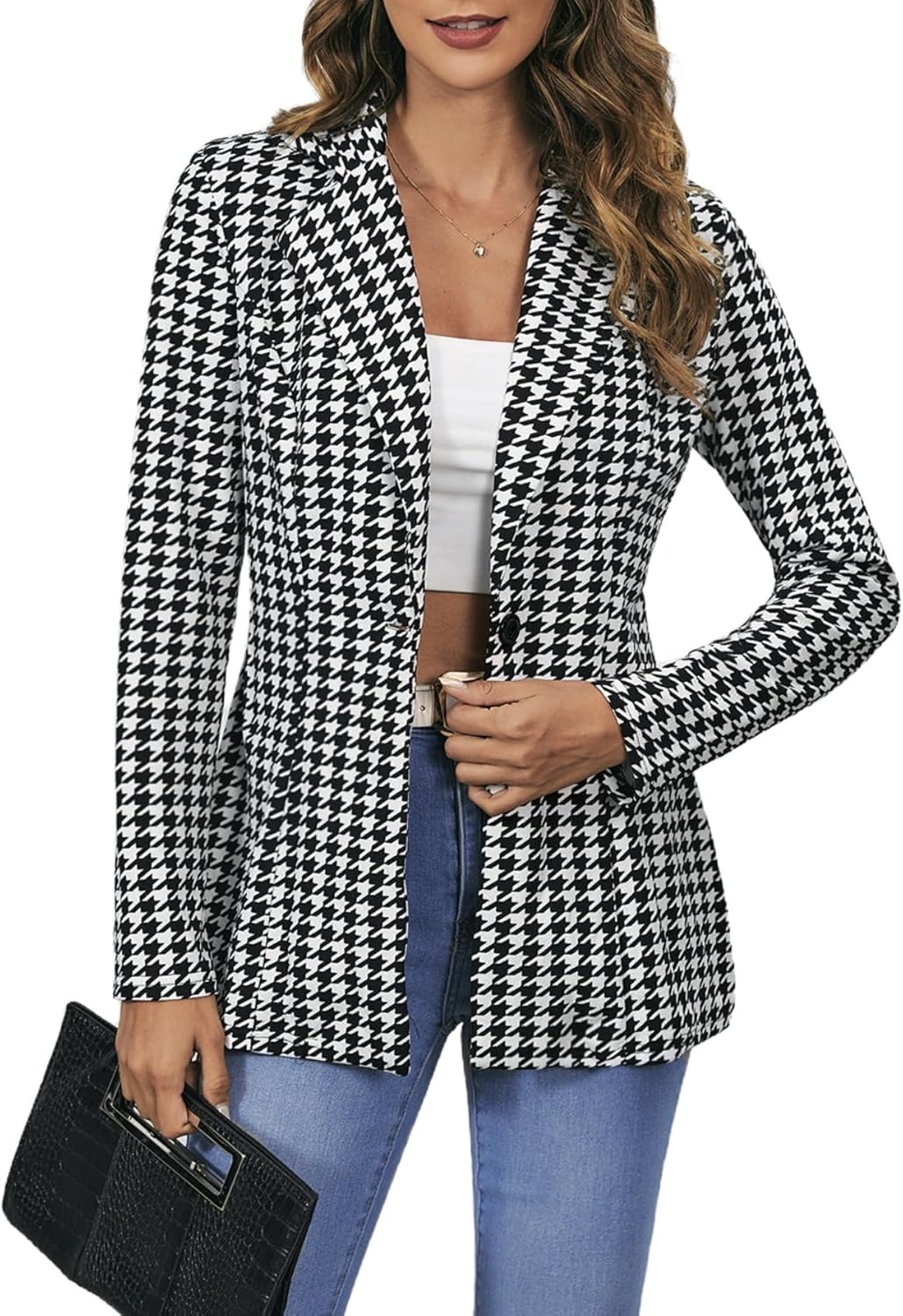 Women’s Houndstooth Blazer Jacket Button Down Long Sleeve Work Casual Blazer