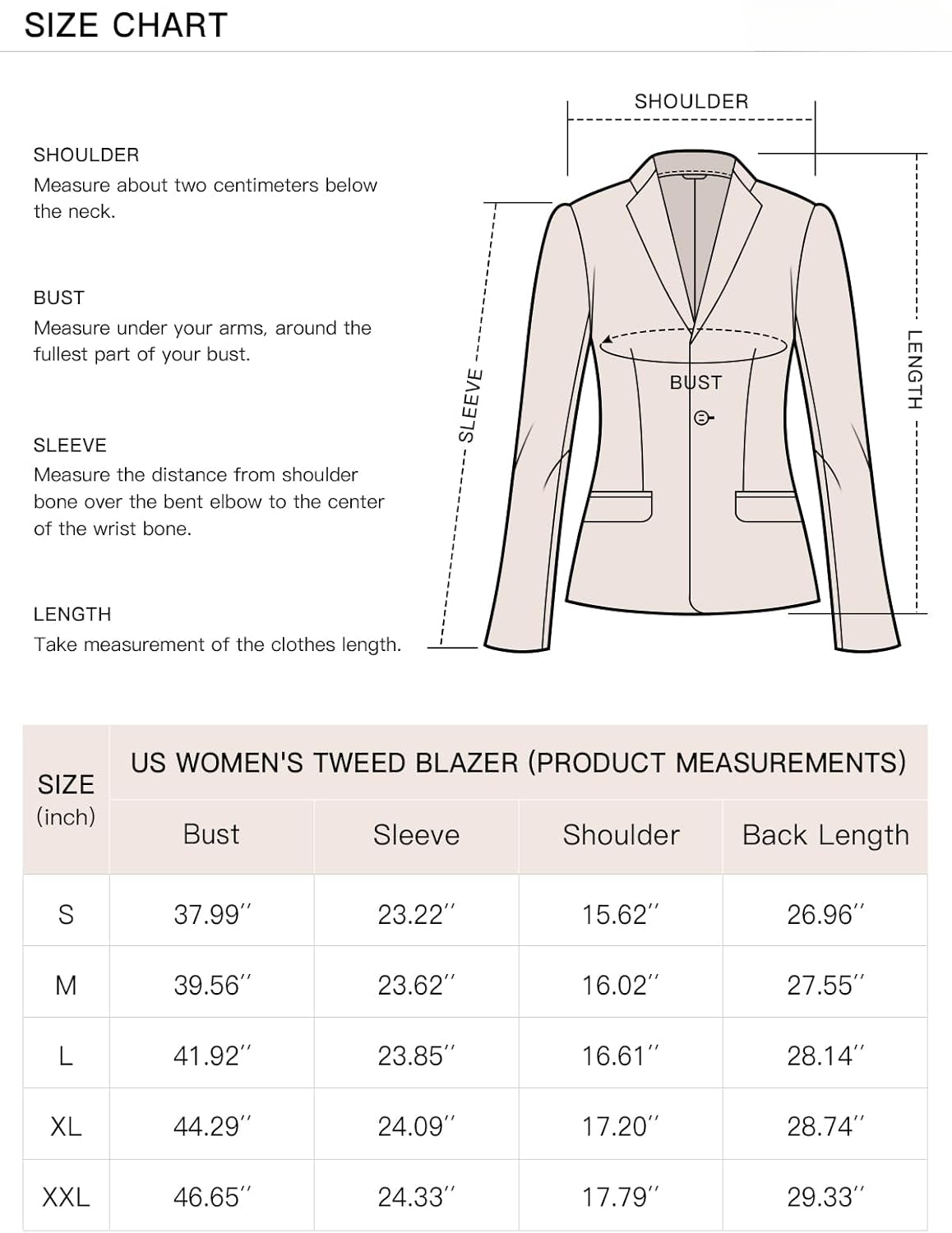 Easy Matching: The timeless tweed design of this blazer makes it easy to match with various tops and bottoms, giving you endless styling options. Whether you pair it with a blouse and trousers for work or with a dress for a night out, the possibilities are endless.