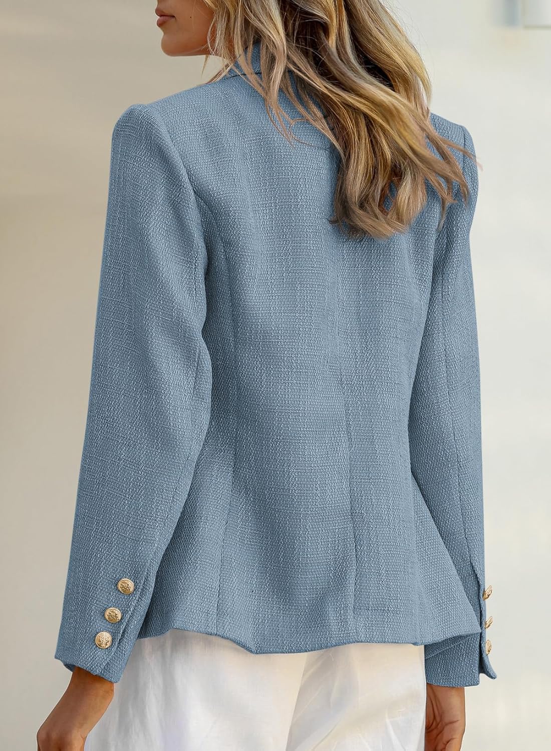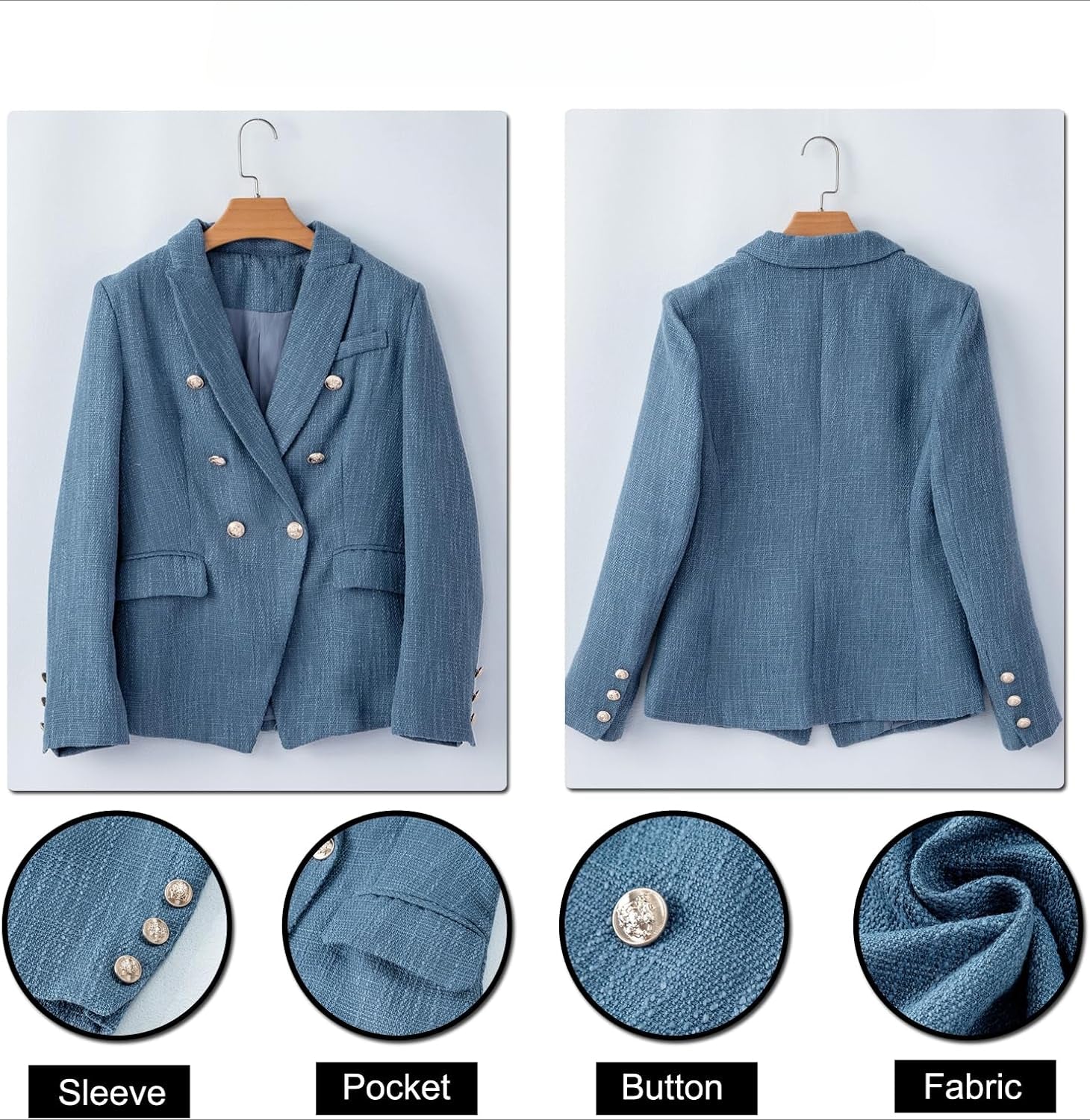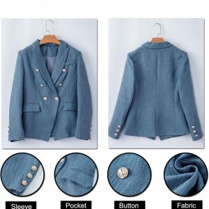 Feature: Double breasted, long sleeve with buttons,front side pockets,lapel collar, turndown collar, solid color, slim fit, open front casual work office business tweed blazers for women.