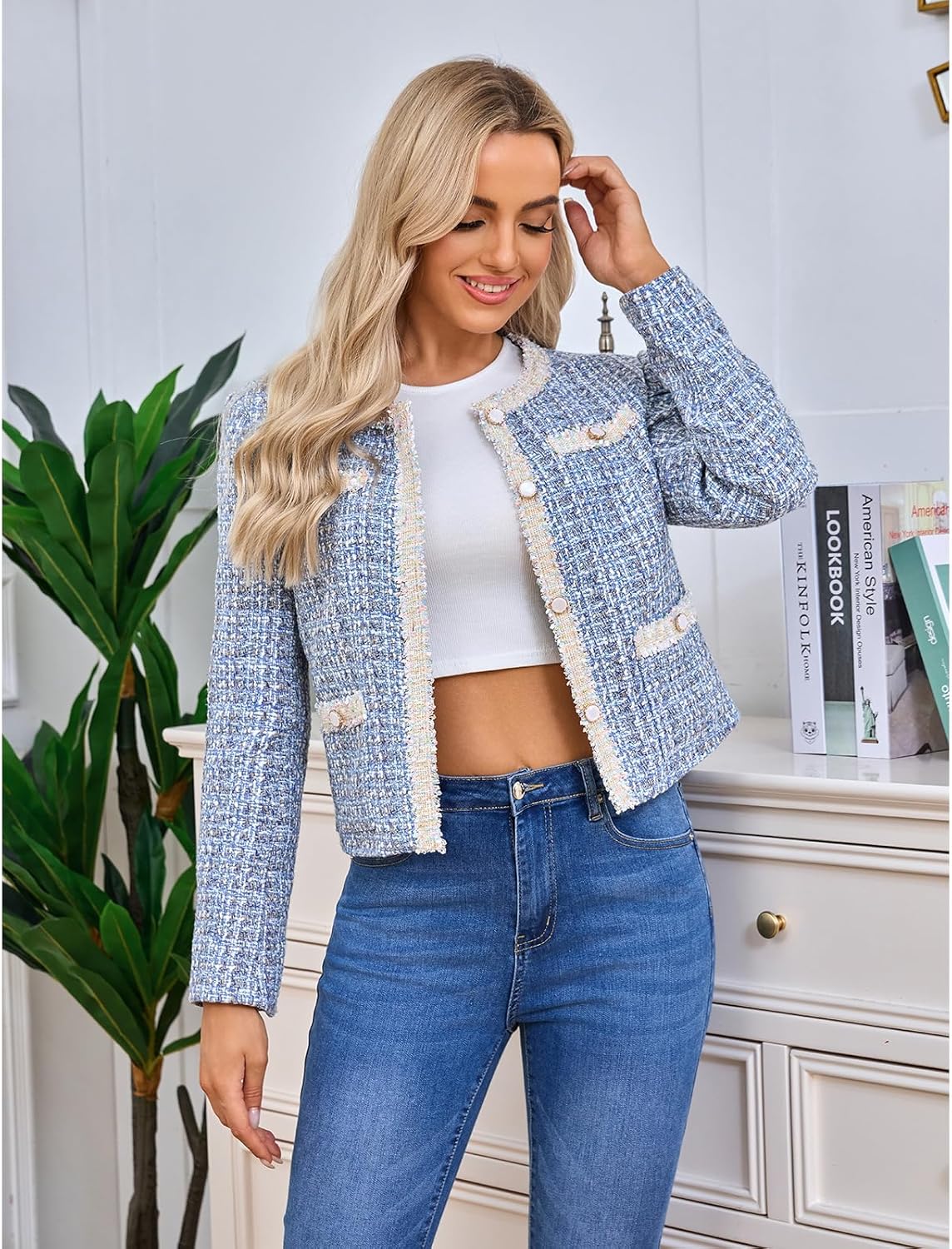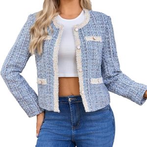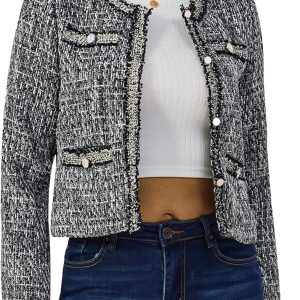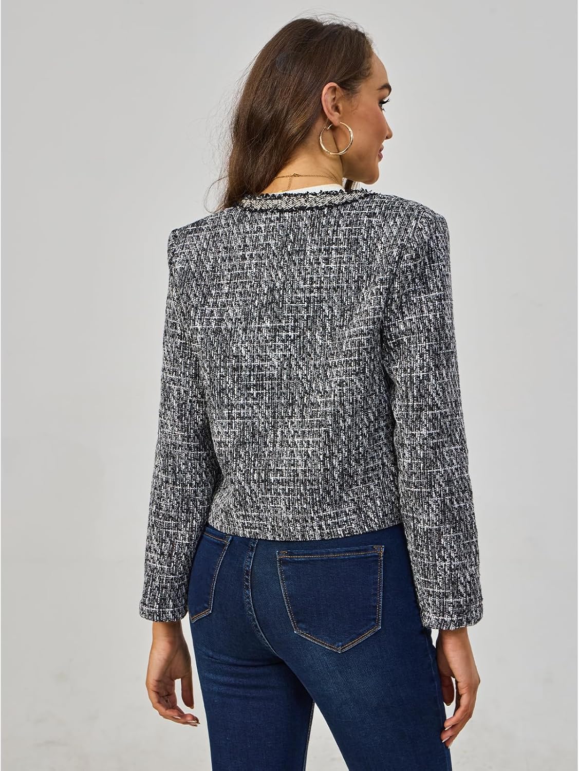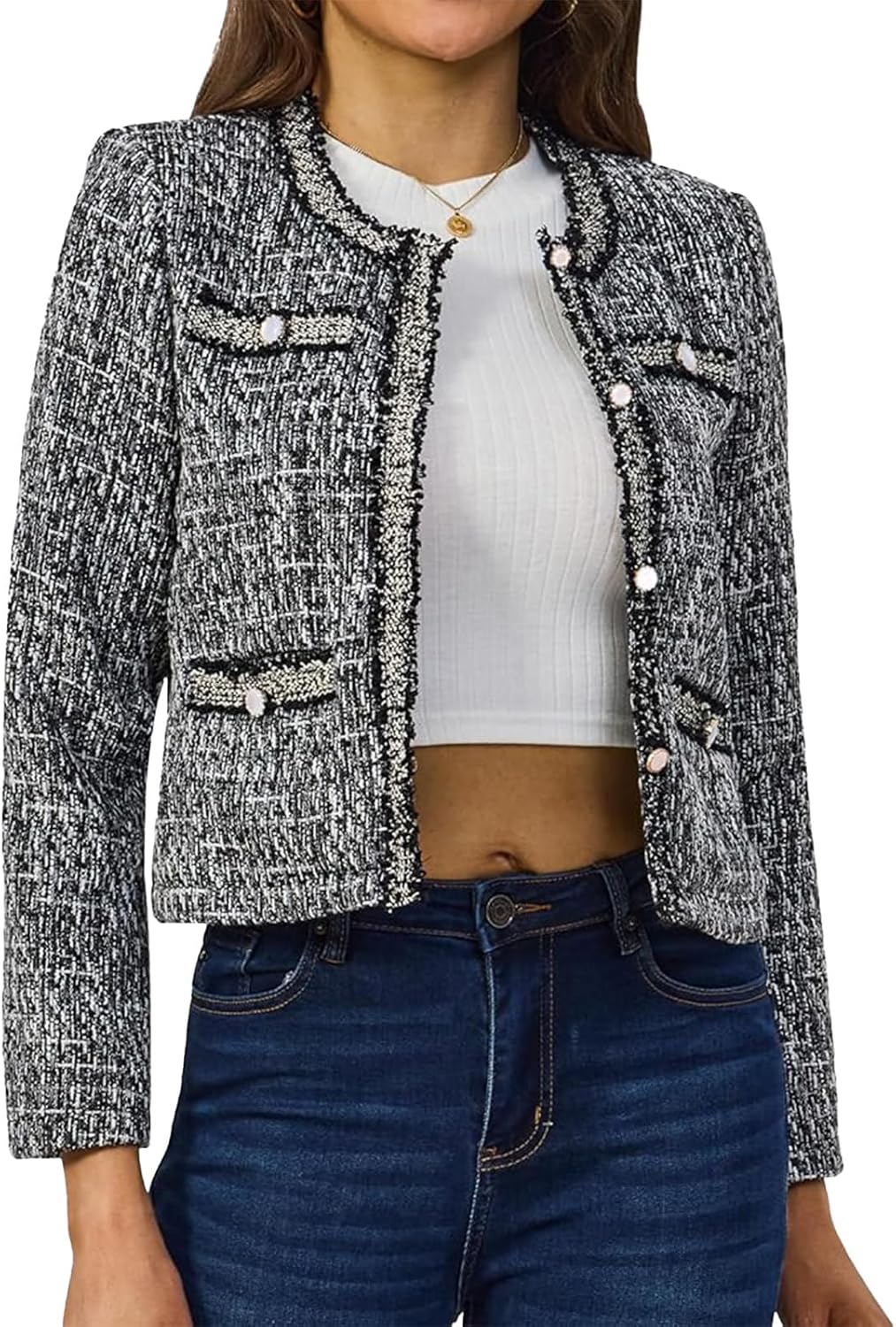 Tweed Blazer Jackets for Women Long Sleeve Elegant Office Work Business Casual Cropped Tweed Jacket